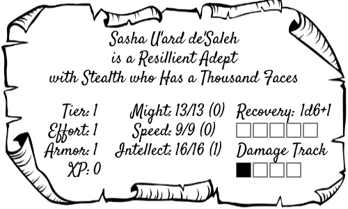 - trained: might defense, intellect defense, stealth, slight of hand, deception, persuasion, cooking, playing the lute